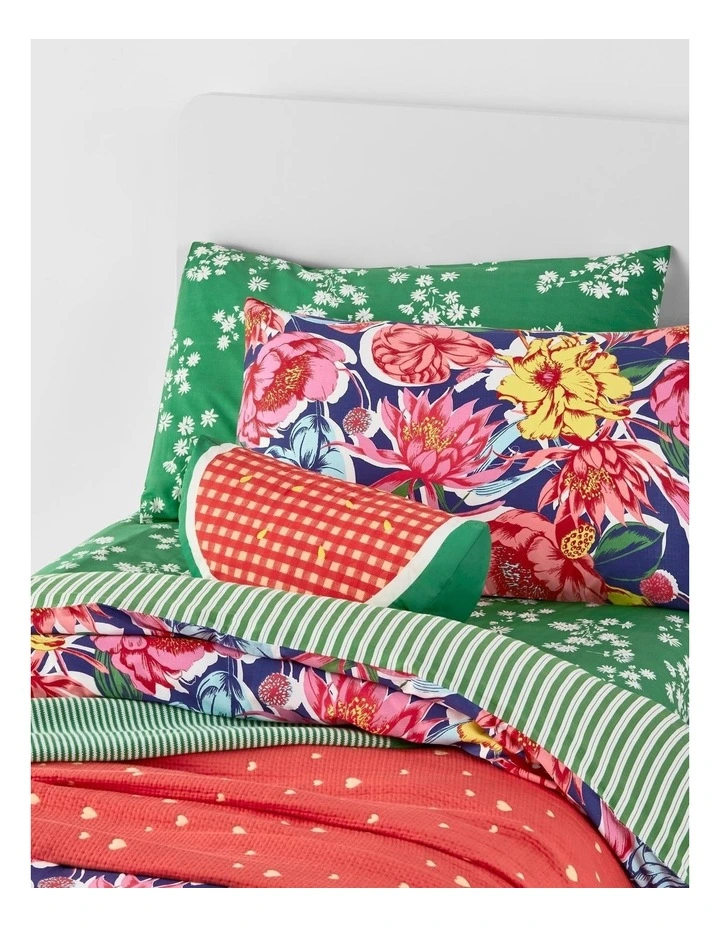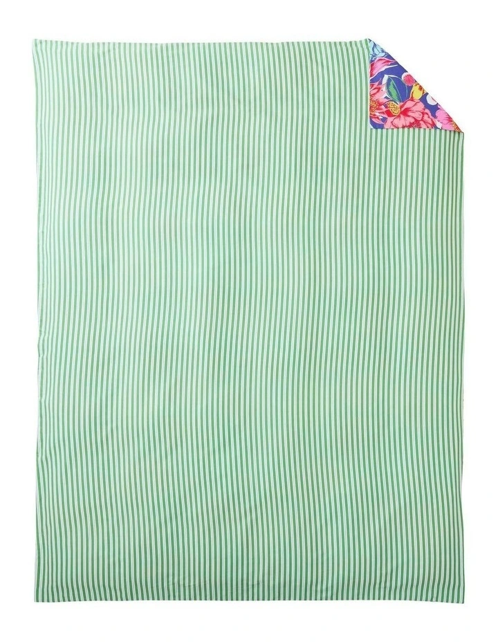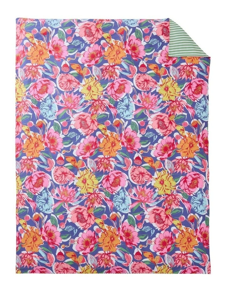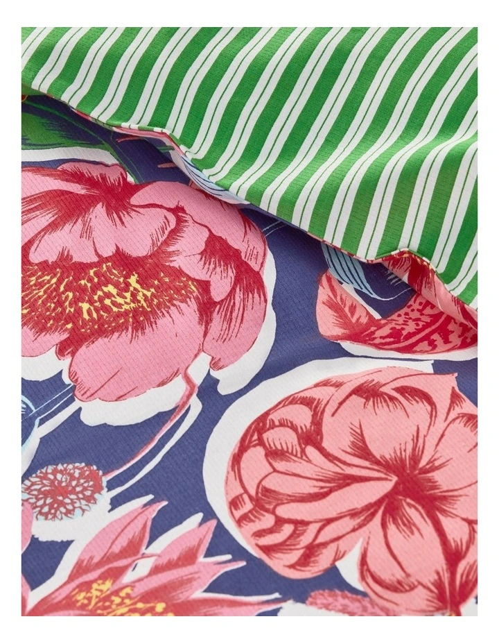 Bright and bold, the Bloomie Quilt Cover invites the sights of summer into the bedroom. Statement florals printed on organic textured cotton contrast with an awning stripe on the reverse. Includes one quilt cover; coordinating pillowcase and accessories sold separately.